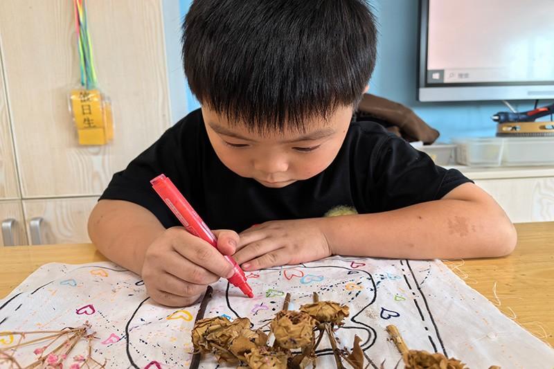 说干就干,孩子们将制作好的干花一朵朵小心翼翼地放在布上,并请朱老师帮忙用热熔胶粘在布上,还在布上画上了漂亮的花瓶。“哇!干花做成这样子可真漂亮呀!”贝贝大声夸奖道。