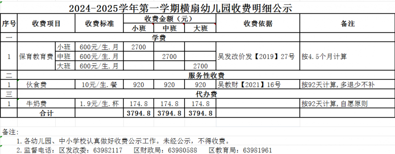 横扇幼儿园2024~2025学年第一学期收费公示